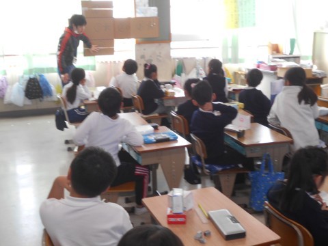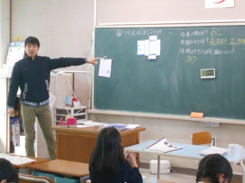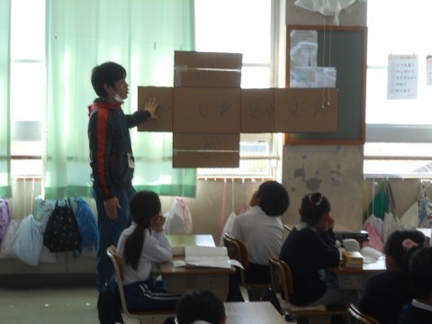 2クラスとも算数で箱の形について学習をしていました。面の形に注目して形や,どことどこの面が同じなのかを確認していました。形が複雑になってくると「向こう側の面」のイメージが難しくなってきます。