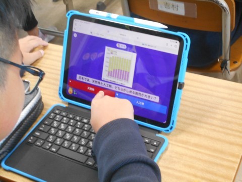 2組は社会のまとめをタブレットを使って,クイズ形式で復習していました。どうしても早押しになってしましますが,問題をよく見て学んだことを答えられるようにしましょう。