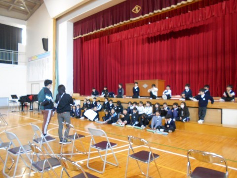 1年生は合同で,次に小学校へ入学してくる新しい1年生に向けたメッセージを撮影しています。