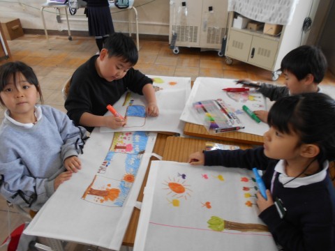 1組では,図工の学習でこれまで取り組んだ作品を入れる作品バックに絵を描いています。季節の移り変わりの様子やお家の家を描いている人もいます。