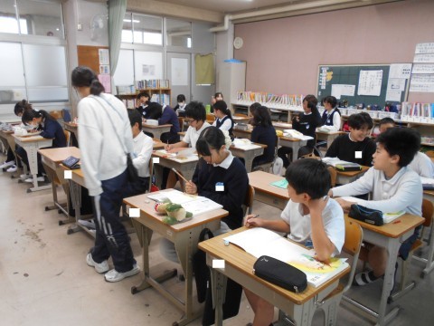 1組では,国語「伝わるかな,好きな食べ物」の学習をしていました。好きな食べ物の名前を言わずに,その食べ物のおいしさを伝える文章を考えます。色や形を表す言葉や比喩表現など,どんな表現がいいかじっくり考えていました。