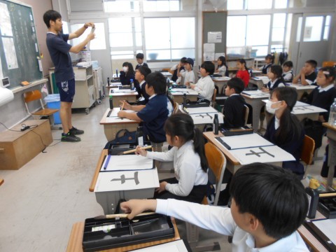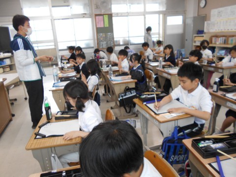 4/23 3年生「書写」 公開日 2026/04/23 更新日 2026/04/23 3年生 1組でも2組でも書写に取り組んでいます。3年生からスタートした習字の学習。準備から初めての事ばかりです。机の上のセットの仕方や筆の持ち方など丁寧に確認をしていきます。