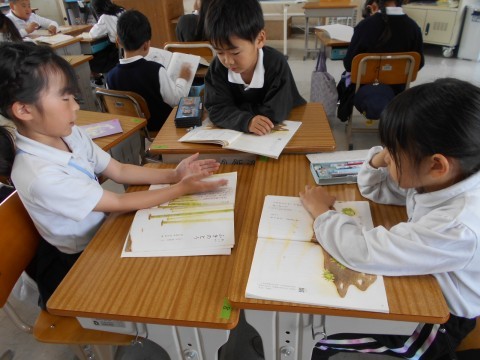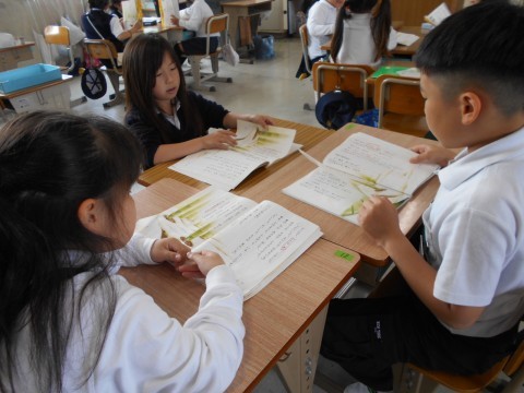 2組では,国語「ふきのとう」の学習をしています。役に分かれて音読の練習をしいています。本文を手掛かりに,「小さく読む」や「かなしそうに読む」など