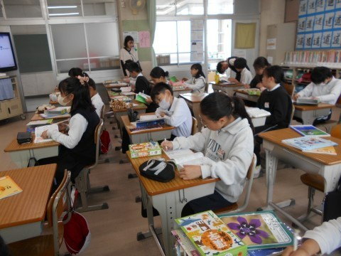1組では国語で「漢字のなりたち」について学習しています。「草」のように音を表す部分と,意味を表す部分があわさってできた漢字を辞書を使って探していました。