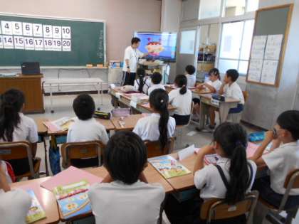 2組では、外国語の学習をしています。数を英語で表すと…Fの発音は日本語にはない音です。Fを発音するために、どんな口形にするといいのかな?お家の人にも伝えてあげてくださいね。