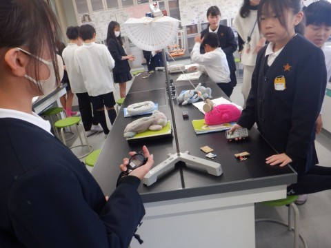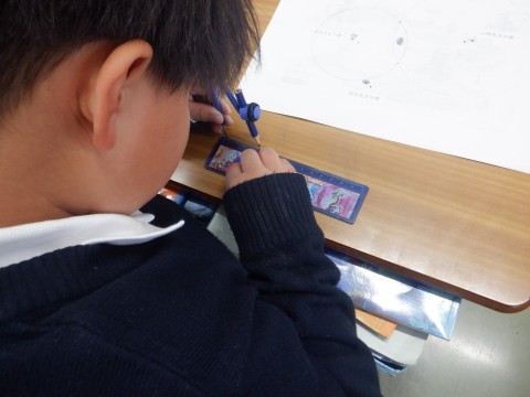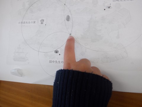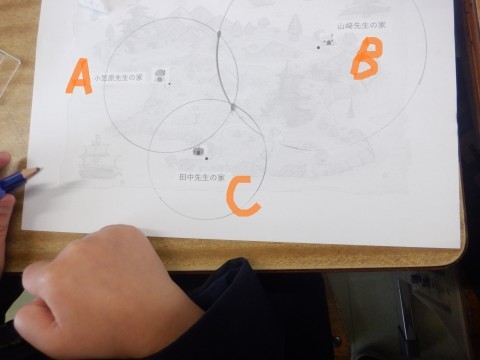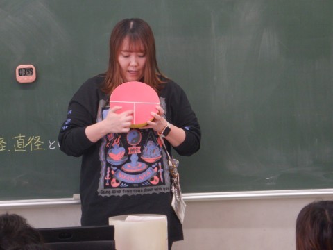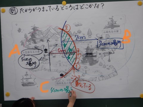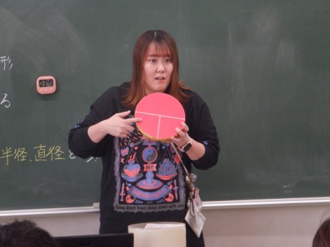 そこで,箱のある位置から同じ距離になるように,巻き尺で長さを決めて並ぶようにしました。巻き尺の長さは円の半径になります。このあと,円についての学習が深まっていきます。