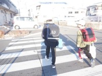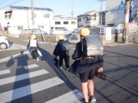 今朝の登校の様子です。雲が厚く、雨もぱらついています。
