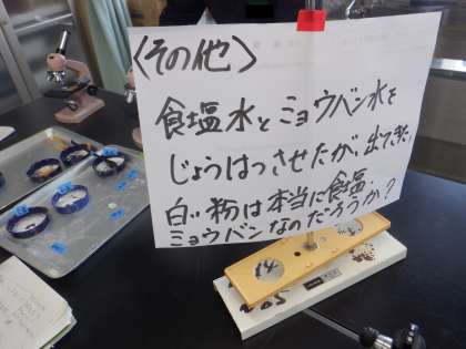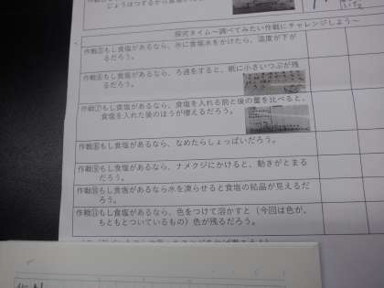 昨日の5年理科の学習です。水に溶けた食塩やミョウバンが、見えなくなってはいるが存在していることを確かめるための実験方法をいろいろと考えています。それらを試すことができるように、場設定がされています。