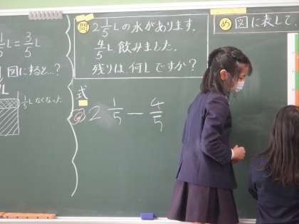 4年4組 算数 分数の計算 1 公開日 2025/01/24 更新日 2025/01/24 4年 4年算数の学習です。2と5分の1から5分の4をひく問題に取り組んでいます。ひき算は成り立ちますが、このままの形での分子だけの計算では、答えが出ません。