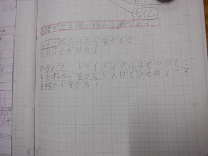 3年2組 理科 6 公開日 2025/01/27 更新日 2025/01/27 3年 実験結果を記録しています。トライアングルは、金属の部分をもったときと、そうでない時の音が違うことに気づきました。これはなぜなのでしょうか。