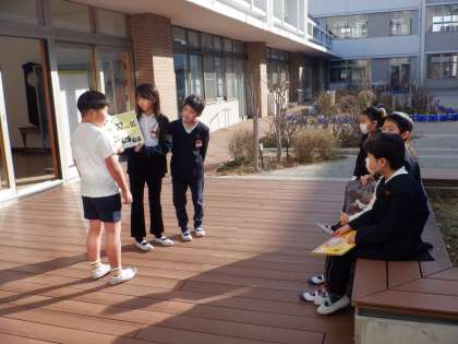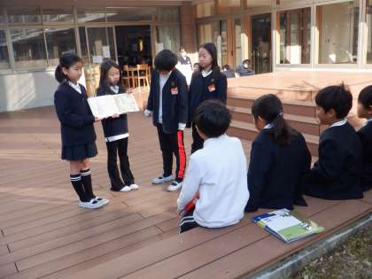 3年生が、1年生に読み聞かせをしました。中庭の陽だまりの、少し暖かいところを選んで読み聞かせをしています。