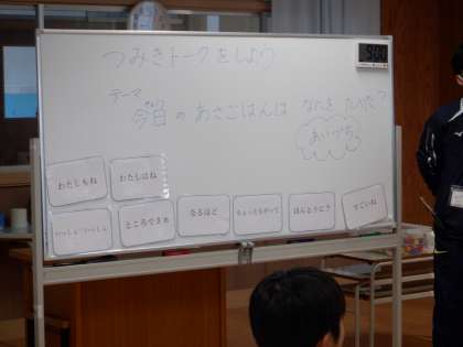太陽学級の様子です。今日の朝ごはんは何を食べたか をテーマに、「積み木トーク」をしました。決められた話題について話をすると、積み木を1つ積むことができます。