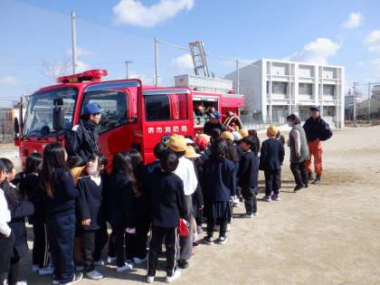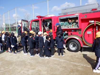 避難訓練の後、1年生は消防車を見学されてもらいました。