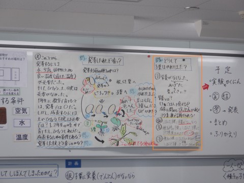 昨日の5年理科の学習です。発芽した後のインゲンマメの子葉がしぼんでいくという変化に気づきました。これはどうしてなのかを考えています。