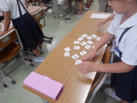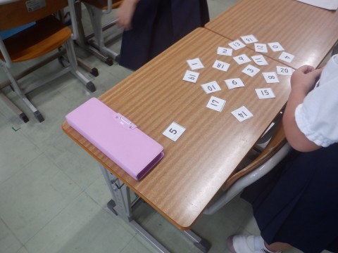 1年算数の学習です。机に20までのカードを並べています。先生が出す問題の答えの数カードを取ります。