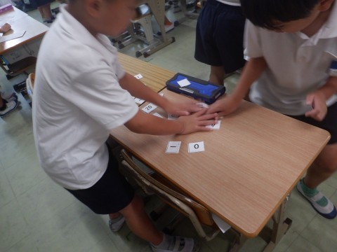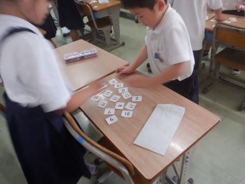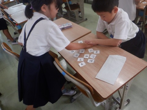 答えが20までの繰り上がりのないたし算はすでに学習しているので、それを使ってカードを取り合います。