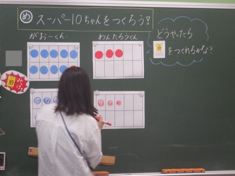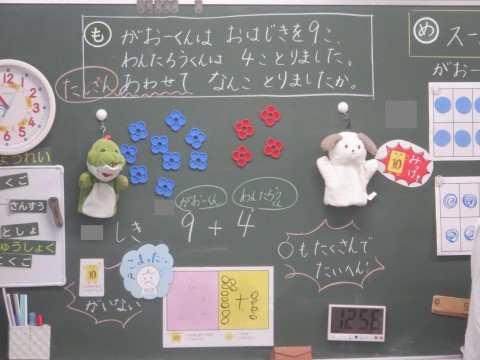 1年算数の学習です。9+4になる問題ですが,繰り上がりを始めて学習します。