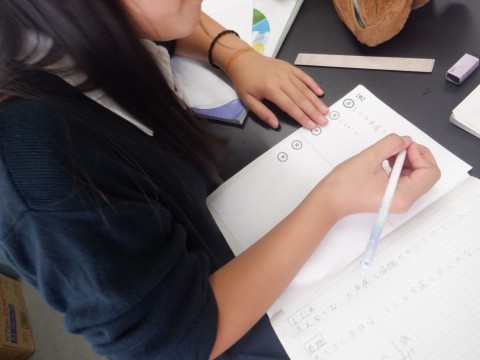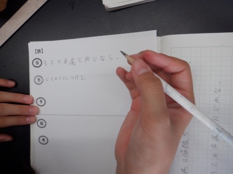 各自の考え(仮説)を検証するための実験方法を考えているところです。この人は,磁石を使って鉄かどうかを調べる方法を考えました。