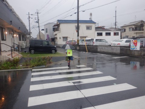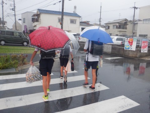 今朝の登校の様子です。登校時間帯になって雨が降りだしました。