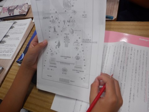 変容をとらえるワークシート,中心人物が行った場所や見たものを記した地図などを使いこなして,ねらいに迫っていきます。