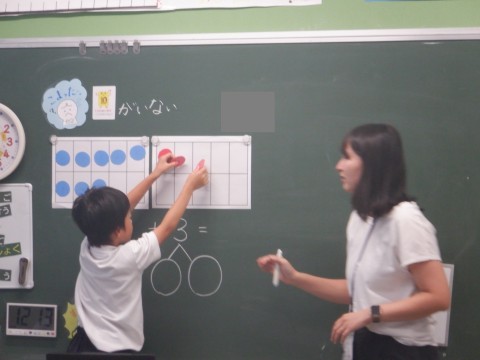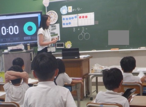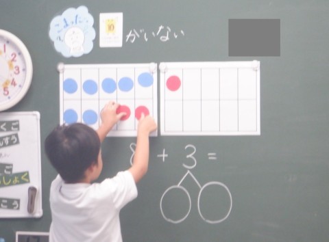 1年算数の学習です。前の時間の8+3の計算を復習しています。3を2と1に分けて,その2を8と合わせて10を作っています。