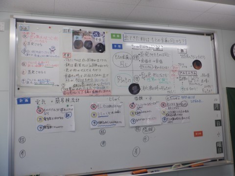 6年理科の学習です。塩酸の水溶液に鉄・アルミニウムを入れると,最後にはとけて姿が見えなくなりました。そこで,火にかけて水溶液を蒸発させ,溶けていたものをとりだしました。前の時間には,とりだしたものはもとの金属と同じものなのか,「同じ」「違う」それぞれの仮説から,それを検証する実験方法を考えました。この時間はいよいよ実験で仮説を確かめます。まずは,とりだしたものを水と塩酸に溶かして,もとの鉄やアルミニウムとの反応の違いを見ます。