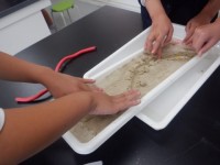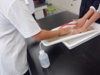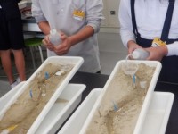 5年家庭科の学習です。ミシンの使い方を覚えて,布を縫う練習をします。
