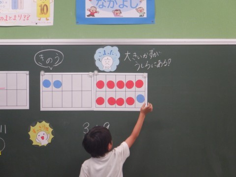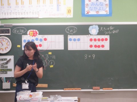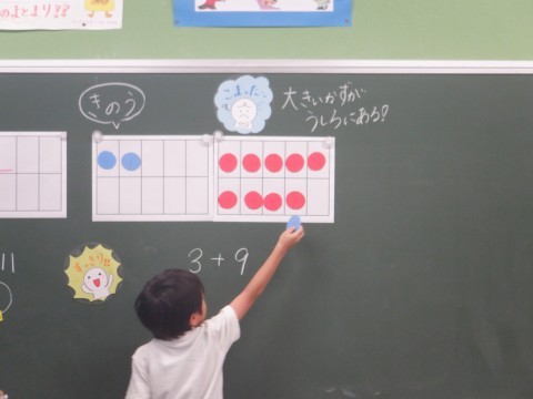 1年算数の学習です。前の時間に学習した,3+9の計算の仕方をふりかえっています。これまでとちがって,「+」の後ろの数を「10」にするとわかりやすいことを確かめました。
