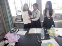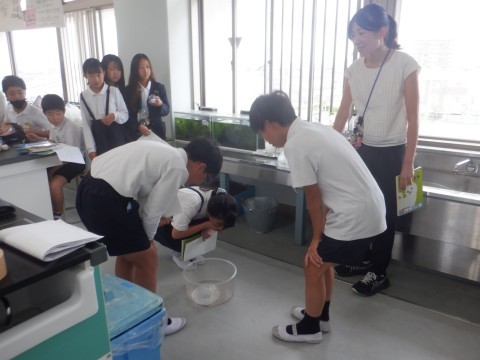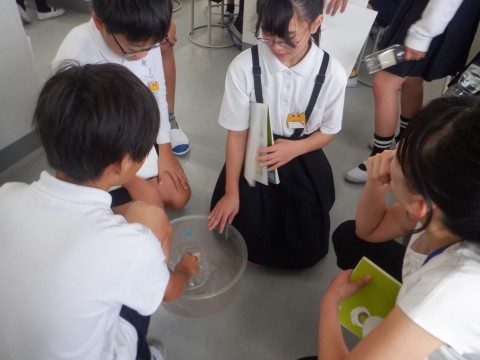 羊水が胎児を衝撃から守っていることを確かめる実験をしています。ビニール袋に羊水に見立てた水を入れ,胎児の代わりには小さな水風船を入れて,水槽の中に落としました。外側のビニール袋は破れるほどの衝撃があっても,中の水風船は無事でした。様々な方法でそれぞれのテーマを追究しています。