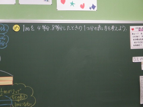 続いて,1mの4分の1や8分の1をどう表すかを考えます。