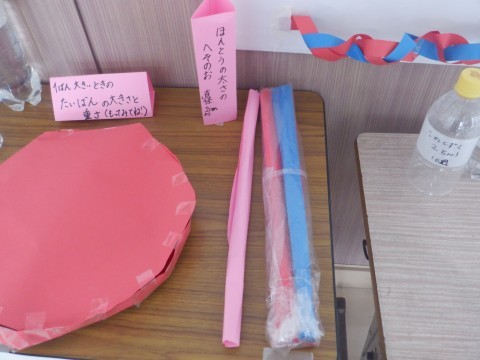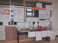 胎盤についての学習の成果物です。実際の重さ・大きさの胎盤の「模型」,実際の大きさのへその緒の「模型」を展示しています。