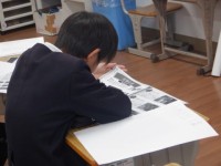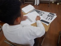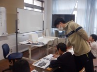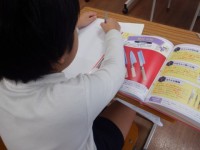 本の中からポスターに書きたい部分を選び出し,それを要約します。どう要約するか,先生がアドバイスしています。
