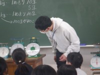 はかりによって,同じ重さまでのめもりの細かさに違いがあることを説明しています。上は4kgのはかり,下は1kgのはかりですが,同じ100gまでの幅に違いがあります。重さの読み取りやすさが違ってきます。