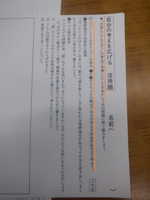 5年 国語 つけた力を生かして 1 公開日 2026/02/20 更新日 2026/02/20 5年 5年国語の学習です。「大造じいさんとガン」の学習でつけた力を生かして,4年生の時に学習した「スワンレイクのほとりで」という作品を,情景描写や人物の変容をとらえ,改めて読み解こうとしています。