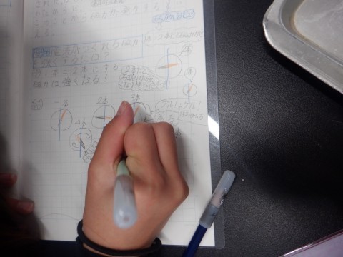 実験の結果をノートにていねいにまとめています。巻き数が多いほど磁力が強くなるようですが,さらに考察を加えて,仮説を立てていきます。