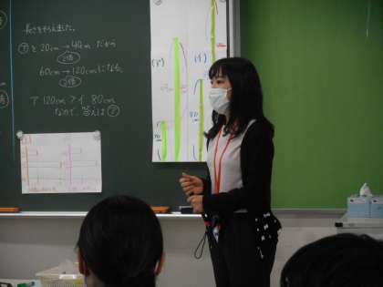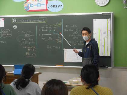 児童役の先生が,黒板に書いた自分の考えを説明しているところです。