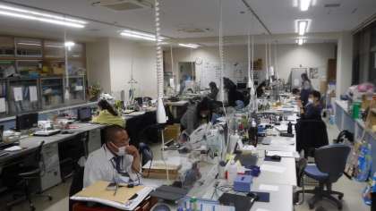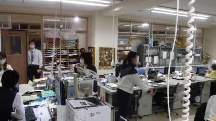職員室では授業を考えたり,事務作業をしている先生が多くいます。