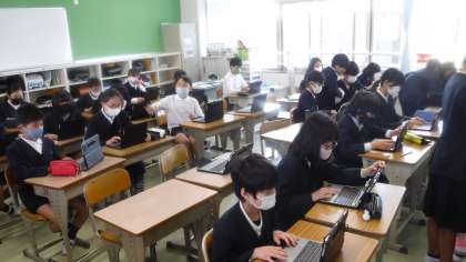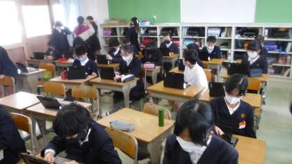 タブレットで学習しながら,すきまの時間に先生が一人ひとりの写真を撮っています。