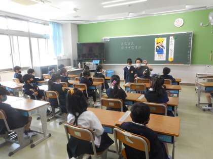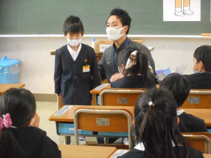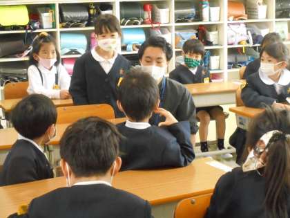 2組の様子です。自己紹介をしています。先生がそばにいてくれるので安心です。