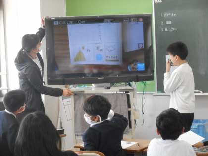 4組の様子です。「かがやき」の詩を絵に表して,友だちと意見交換をしています。大型テレビに写真を投影して,説明する場面もありました。