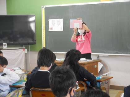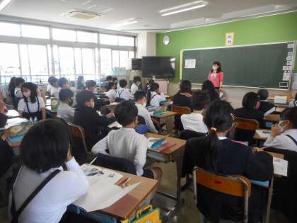2組のようすです。国語の学習をしています。国語ノートの使い方を先生から聞いています。