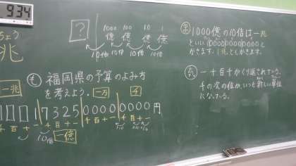 4年3組 算数 公開日 2021/04/14 更新日 2021/04/14 4年 大きい数について学習しています。 授業後に億・兆より上の数に興味がある子が先生の所に集まっていました。 自主学習などで調べてくるようになるといいですね。