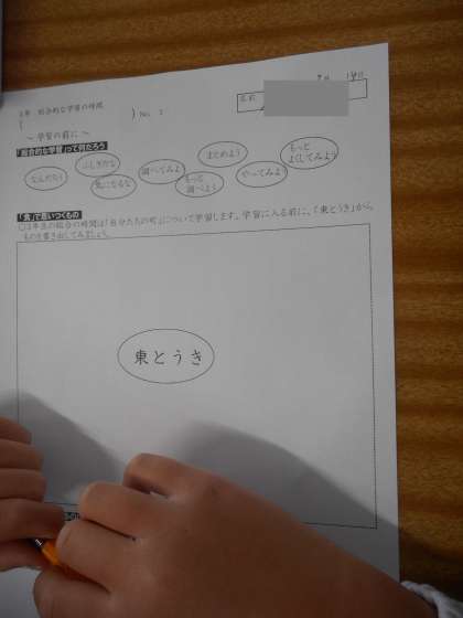 3年の総合の学習です。真ん中に「東とうき」と書かれたワークシートが配られました。