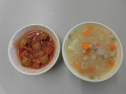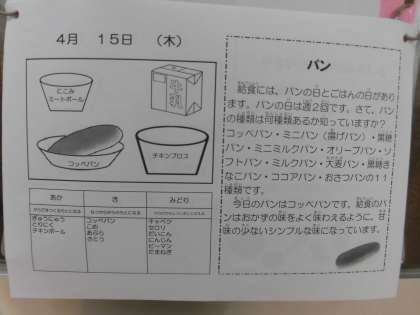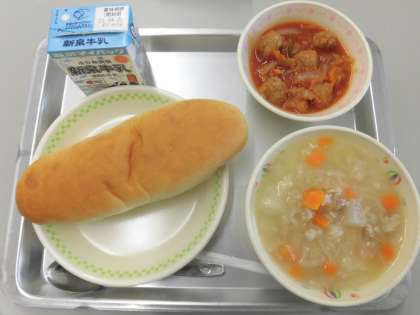 1年生初めての給食 〜本日のメニュー〜 公開日 2021/04/15 更新日 2021/04/15 食育・給食 今日のメニューは「パン・牛乳・にこみミートボール・チキンブロス」です。 1年生初めての給食。みんなで協力して上手に準備して,たくさん食べてくださいね♪