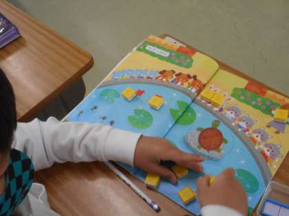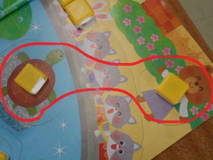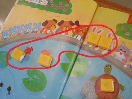 さっそくブロックを置いています。おなじ「2」のウサギと金魚,「1」のクマの先生とカメを見つけて,ブロックを置くことができました。