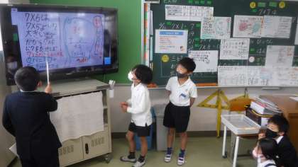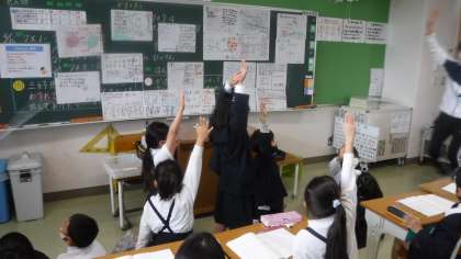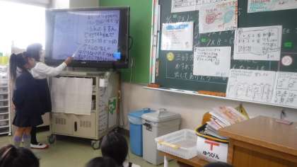 7×6の計算の仕方について,考えています。 みんなで協力して発表をしています。先生が聞き方についてよく褒めていました。