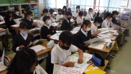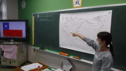 世界の国旗について考えています。 教室に入ると,どこの国旗なのか?質問されました。楽しそうな雰囲気でした。