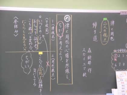 6年3組 国語 「帰り道」 公開日 2021/04/16 更新日 2021/04/16 6年 物語『帰り道』の学習の様子です。 「律」と「周也」,二人の視点で読み進めています。 みんな真剣に読んでいました。