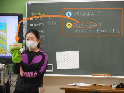 1年算数の学習です。赤で囲んだいぬさんとバケツはどちらが多いのか,ケロリーナちゃんにわかるように説明しよう という勉強です。