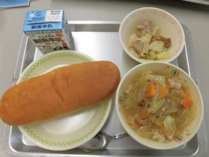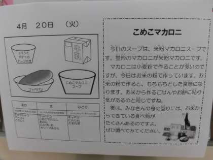 本日のメニュー 公開日 2021/04/20 更新日 2021/04/20 食育・給食 今日の献立は「コッペパン・牛乳・米粉のマカロニスープ・チキンとポテトのハーブ焼き」です。星形の米粉マカロニ,もちもちしていてとってもおいしいですよ♪